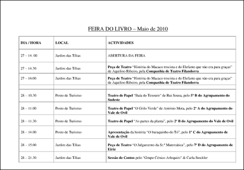 Está quase a começar a Feira do Livro 2010, promovida pela Biblioteca Municipal de Baião. Entre os dias 27 e 30 de Maio, são diversas as actividades previstas. Fica-nos o programa deste evento para aguçar apetites... Carregue aqui para ver a totalidade do programa.